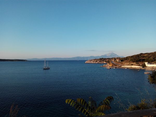 Leider hat Irina auch Regen mitgebracht, aber bis zum Abend lacht uns in Ormos Sikia wider die Sonne entgegen, überschattet vom allgegenwärtigen Berg Athos, auf dem auch Mitte Mai immer noch Schnee liegt: