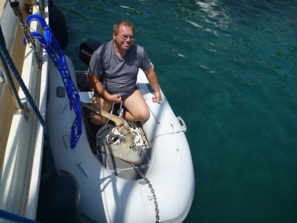 Nachdem das ganze vorbei ist, hole ich den zweiten Anker wieder ein, da die Trosse in der aktuellen Lage dazu prädestiniert ist, fremde Anker zu fangen. Der Kat, der neben uns längseits an der Pier liegend, dieses bislang verhinderte, ist nämlich weg. Erstaunlicherweise gelingt das Einholen ebenfalls vom Dinghy aus, womit ich eigentlich gar nicht gerechnet hatte.