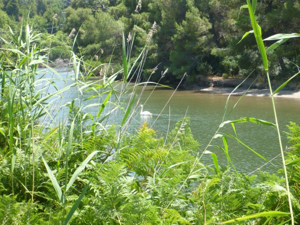 Hier tobt das pralle Strandleben. Von Banane über Wassersessel und Wasserski ist alles vorhanden was laut ist und Wellen verursacht. Aber der Strand ist sehr schön und unmittelbar dahinter verbirgt sich hinter einem idyllischen Wäldchen mit dichtem Kieferbewuchs ein Naturschutzgebiet mit Lagune und schwarzen und weißen Schwänen:
