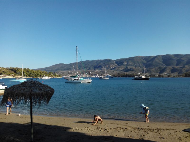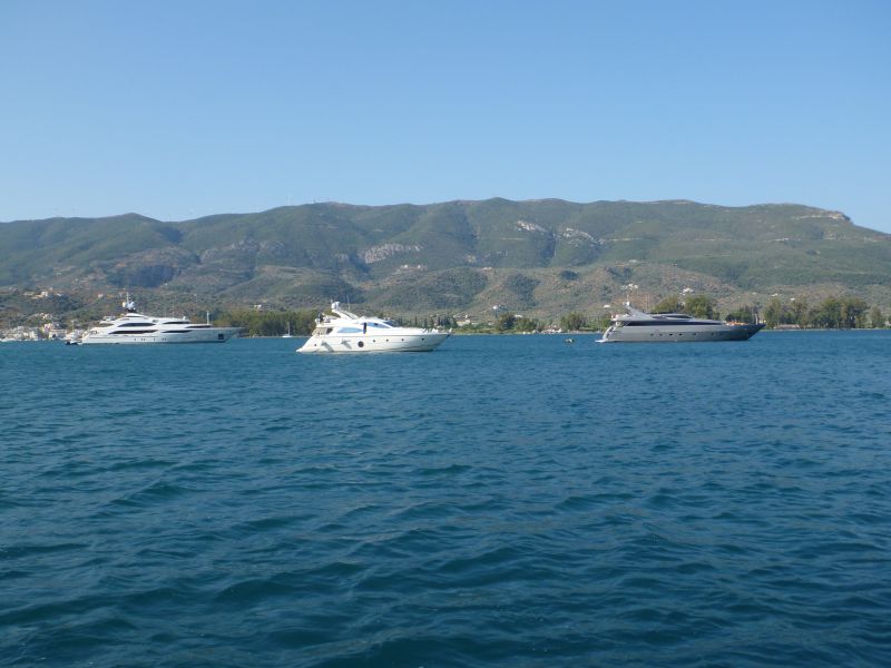 Reich und schön stört das nicht, die ankern gleich deutlich außerhalb der Bucht in dem schmalen Sund zwischen der Insel Poros und dem Festland.